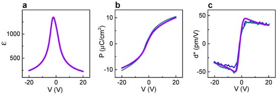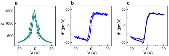 We note that dynamic characteristics (Figure 2 and Figure 3) are measured by applying a sine voltage of a certain amplitude, which can significantly exceed coercive voltage. Such measurements are impossible for bulk samples and, strictly speaking, their results cannot be immediately apprehended from the common point of view. Another, more conventional approach is to use a small ac voltage and superimpose a biasing dc voltage. For convenience, we denote this regime as “static” here. The real part of the dielectric permittivity, ε, and the effective piezoelectric coefficient, d*, which were measured in the static regime, are presented in Figure 4a,b, correspondingly. Only minor hysteresis is observed for different directions of the bias sweeps in the (ε–V) behavior (Figure 4a), consistent with the slim dynamic (P–V) loops (Figure 2b). Correspondingly, also hysteresis in the (d*–V) behavior is minute. To relate the results obtained in the two different regimes, the dynamic effective coefficient d* was extracted by differentiating the strain–voltage data (Figure 3a). There is a perfect agreement between the extracted dynamic coefficient and the static one (Figure 4c).