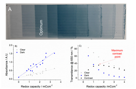 (A) Variable thickness PEDOT-PSS films deposited over the PET substrate where the optimum film is highlighted. (B) Absorbance vs. redox capacity of the films in their oxidized (clear) and neutral (dark) states. (C) Transmittance vs. redox capacity in their oxidized (clear) and neutral (dark) states, together with the corresponding contrast, where the maximum contrast value is identified (red arrow).