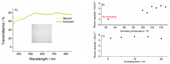 Vanadium pentoxide (V2O5) was used as the charge balancing counter electrode due to its good transparency, adequate electrochemical activity, and the possibility of in-solution deposition by printing techniques. The use of transparent counter electrodes in order to maximize the optical contrast and the color purity in electrochromic devices has been remarked in numerous studies [31,32,33]. While in most cases transition metal oxides are deposited via vacuum related techniques, with an increase in energy requirements and constraints for scale-up massive production, different alternative routes for in-solution processing are presently available, mainly based on the use of soluble precursors and subsequent thermal conditioning [34,35]. In this study, we used a modified route to that proposed by M. Hajzeri et al. [36] (same conditions except the initial precursor solution concentration, which in this case was 0.025 M vanadium triisopropoxide in isopropanol). Briefly, the precursor solution is deposited over the substrate and subsequently submitted to an annealing process (150 °C for 20 min). This method was originally applied to ITO-glass substrates. However, direct application of such high temperatures to PET substrates for a long time results in partial melting and the loss of mechanical integrity. In order to adapt this high temperature process to our PET-ITO substrates, we performed a series of lower temperature annealing cycles. We found that good-quality electrochemically active films could be obtained without compromising the mechanical properties of the PET substrates, reducing the temperature to 120 °C and annealing time to just 10 minutes (Figure 3B,C), how the resulting redox capacities obtained for films annealed at different temperatures from 25 °C to 150 °C, and different annealing times from 1 to 20 min). Optimized resulting films were optically and electrochemically characterized (cycling between −0.5 and 1.5 V vs. Ag wire reference electrode (calibrated 0.1 V vs. NHE) and found to obtain enough redox capacities to compensate the optimized PEDOT-PSS previously calculated with negligible optical contribution (transparency in both states was around 80% including the ITO-PET substrate contribution) (Figure 3). Films with approx. 3 mC/cm2 redox capacity were obtained using 15 μL/cm2 spraying solutions, comfortably exceeding the required redox capacity to compensate for that of the corresponding working electrode.
