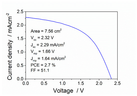 Due to its mechanical characteristics, the versatility for dimensioning a range of different power requirements and the possibility of a complete printing processing fabrication, which correlate with the desired characteristics of the proposed devices, polymer-based organic solar panels in the form of cuttable foils (commercially available Infinity PV-PV foil), were used in this study. The foil was composed of a number of serially connected stripes that can be cut at certain lengths for the needed voltage output. In order to obtain the necessary information for a proper dimensioning of the final system, basic electrical parameters for one of the stripes (7.6 cm2) were obtained under standard AM1.5 illumination. Figure 4 shows a representative J–V curve obtained and the associated open circuit voltage (Voc), short-circuit current (Jsc), maximum power voltage (Vmp), maximum power current (Jmp), power conversion efficiency (PCE), and fill factor (FF).