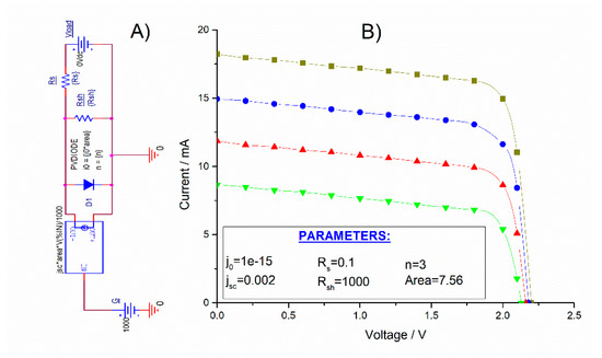 (A) Equivalent circuit used for the modeling of organic solar cells. (B) Generated I–V curves for different irradiance values: Green line (600 Wm−2), red line (800 Wm−2), blue line (STC 1000 Wm−2), and yellow line (1200 Wm−2). Inset: Parameters used for generating the corresponding I–V curves.