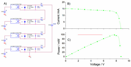 (A) Equivalent circuit used for a 4-cell string (serially-connected) organic solar module. (B) Generated I–V curves for standard irradiance STC 1000 Wm−2. (C) Power–voltage curve identifying the maximum power point.
