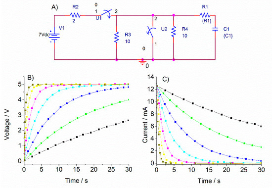 The electrical behavior of the electrochromic device was also simulated by a corresponding equivalent circuit. An electrochromic device is an electrochemical cell that undergoes charge and discharge processes. Components (electrodes, electrolyte, wire connections) can be modeled by resistive/capacitive RC nets [37]. We used a simplified model in which the electrochromic device is represented by a single RC tandem (R1 + C1 in the scheme shown in Figure 8) and the addition of parasitic resistances corresponding to wiring or ITO substrate resistance due to the big areas considered (R2–R4 in the scheme). Transient current-time responses were simulated for different C1 values (ranging from 0.001 to 0.1 F). Values of R1 = 400 ohm and C1 = 0.01 F (cyan line in Figure 8 graphs) showed the better agreement with the previously obtained current–time electrochromic device evolutions, with voltages between 0–5 V and charge–discharge times around 20 s.