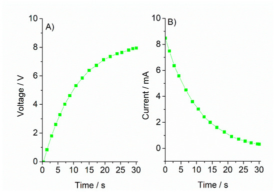 (A) Voltage–time transient and (B) current–time transient for an integrated photovoltaic-electrochromic system, simulated under STC (1000 Wm−2, 25 °C).