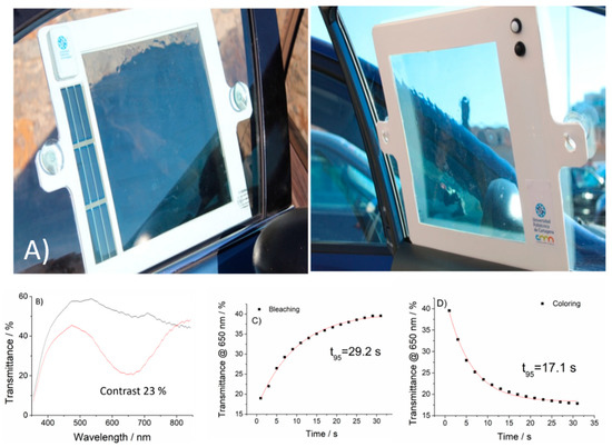 Optoelectrochemical characterization of the devices was carried out, resulting in a contrast of 23% at 650 nm (for 0 to 4.5 V applied potentials), in agreement with the previously obtained values for lower surface devices (Figure 10B).