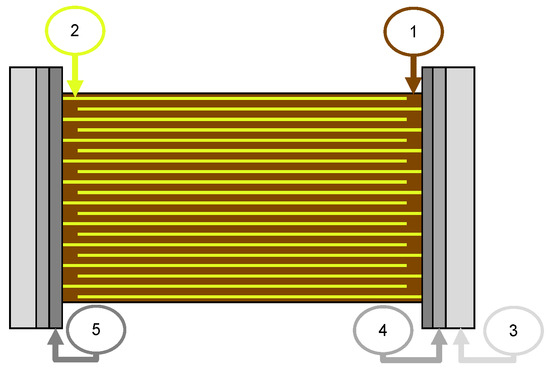 Class 1 ceramic capacitors (e.g., C0G, U2J) are currently widely used for inductive power transfer due to their very stable capacitance against temperature, voltage and aging, compared to ferroelectric class 2 capacitors (e.g., X5R, X7R). However, due to the high dielectric constant of ferroelectric ceramics for a defined temperature range, a much higher capacitance density can be achieved. As an example, to obtain a capacitance of 470 nF with class 1 capacitors, a volume of approximately 24.5 mm3 is required [19]. A volume of about 0.016 mm3 is sufficient when using class 2 capacitors [20]. Materials such as barium titanate, calcium titanate, strontium titanate, magnesium titanate, and calcium zirconate, to name but a few, can be used as dielectric for ferroelectric capacitors. The material composition and the grain size of the dielectric result in different dielectric constants and temperature dependencies [21,22]. However, the exact structure of the capacitors and its dielectric composition are not given by the manufacturer. A typical structure of such capacitors is shown in Figure 1. Further investigations (e.g., energy-dispersive X-ray spectroscopy, scanning electron microscopy) are required in this regard [23].