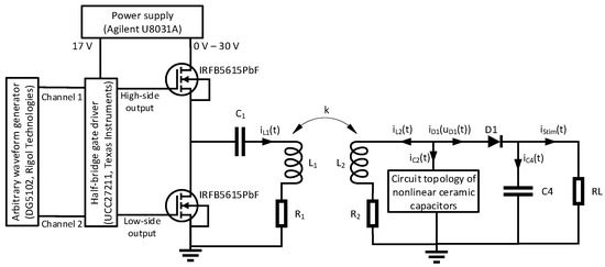 To characterize the circuit topologies consisting of ceramic capacitors, the measurement setup shown in Figure 2 was realized. The series resonant circuit consisting of the inductance L1, loss resistor R1 (760308100110, Würth Elektronik eiSos GmbH & Co. KG, Waldenburg, Germany, without ferrite) and parallel-connected capacitors C1 (FKP1, WIMA GmbH & Co. KG, Mannheim, Germany) is driven through a half-bridge consisting of two N-MOSFETS (IRFB5615PbF, Infineon Technologies AG, Munich, Germany). The half-bridge is driven by a signal generator (DG5102, Rigol Technologies, Inc., Suzhou, China) and a gate driver (UCC27211, Texas Instruments Inc., Dallas, TX, USA). The gate driver is supplied with a constant voltage of 17 V and the half-bridge with a variable voltage between 0 V and 30 V using the Agilent U8031A power supply.