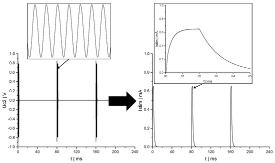 Based on previous investigations and regarding computing time, memory consumption and consistency, the above differential equations are solved using the Adams method with a calculation tolerance of 10−7 [27,28]. The frequency and pulse duration of the inductive power transfer as well as the time span for calculating Uc2 and Istim were set according to the settings in the measurement setup (see Section 2.2). The number of points for a given solution interval is obtained by dividing the pulse duration by 10 ns. Thus, the number of points ranges between 200 k and 900 k. The capacitors were measured at the frequency of inductive power transfer (see Section 2.1) and were interpolated in Mathcad with third-order B-spline functions.