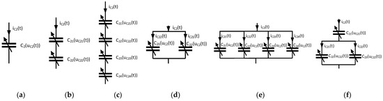 The voltage uc2(t) and current ic2(t) in Equations (1)–(9) are expanded according to the circuit topologies of ceramic capacitors shown in Figure 4.