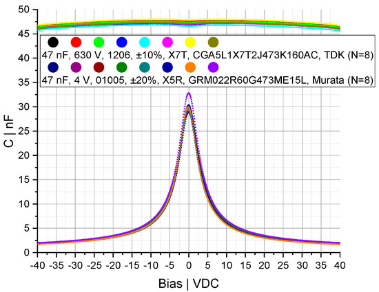 Nevertheless, datasheets and commercially available measuring instruments do not allow a representation of the capacitance over an AC voltage, e.g., +/−40 V and a frequency between 183 kHz and 951 kHz. In addition, the measurement of a voltage-dependent capacitance with a small AC voltage superimposed with a high DC bias voltage does not allow the correct modeling of the nonlinear properties of ferroelectric ceramic capacitors for higher AC voltages (see Figure 6, Figure 7, Figure 8, Figure 9, Figure 10, Figure 11 and Figure 12).