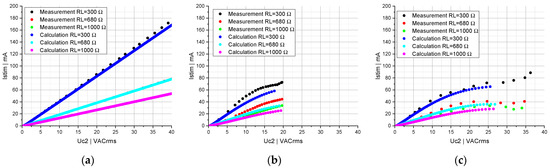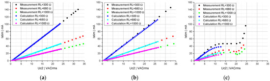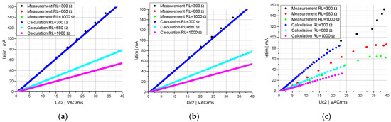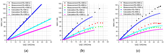 Linear systems in which the stimulation current Istim increases proportionally to the induced voltage Uc2 (see Figure 6a) can be modeled very well with the differential Equations (1)–(9). By introducing a nonlinear capacitor, a stabilization of Istim can be seen (see Figure 6b). For Uc2 lower than approx. 7.5 VACrms, Istim increases nearly proportionally to Uc2. Above a value of Uc2 of about 10 VACrms, load-specific plateaus of Istim can be observed. At values of Uc2 above 20 VACrms, the system becomes unstable, causing Istim to increase sharply. The calculations were not performed over the entire range of Uc2, as voltage peaks below −40 V occur at higher levels of the induced voltages across the nonlinear capacitor. The measured capacitors were not extrapolated for voltage ranges above +/−40 V. The consistency between calculations and measurements in Figure 6b is high for lower values of Uc2, when Istim increases nearly proportionally to Uc2. However, at values of Uc2 above 5 VACrms, the calculation differs from the measurement, independently of the load. In addition, we can observe that the limitation of Istim is more pronounced in the calculation than in the measurement (see Figure 6b).