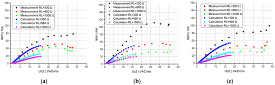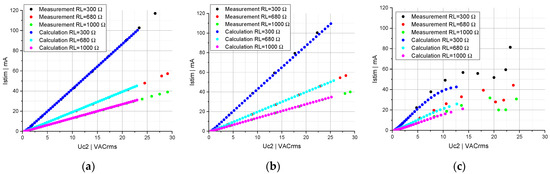 Stimulation current Istim as a function of the induced voltage Uc2 for a circuit topology of two series-connected: (a) linear capacitors; (b) linear and nonlinear capacitors; (c) nonlinear capacitors. The measurements (black, red, green) and calculations (blue, cyan, magenta) were performed for RL = 300 Ω, 680 Ω and 1000 Ω, respectively.
