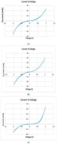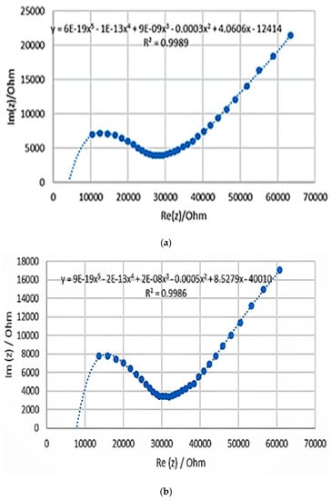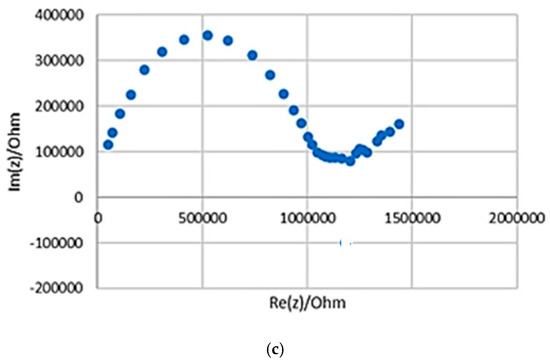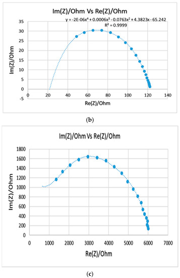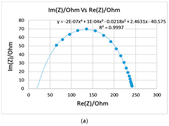 EIS is a technique used to measure the electrical impedance of a device using a sinusoidal signal [12,13]. An impedance scale is observed by varying frequencies (100 Hz–7 MHz) over the desired range. An alternating current was applied, and the output was observed as a function of t frequency. The EIS calculations were carried out with the aid of a potentiostat (Biologic, model SP-200 with EC lab software v11.02), as shown in Figure 1a. The EIS data is provided as a Nyquist plot, which was analyzed to determine the sample’s bulk impedance. The sample impedance was also measured at a standard frequency of 1 kHz. The equation below was used to determine the conductivity of the fabricated samples (σ) [7]: