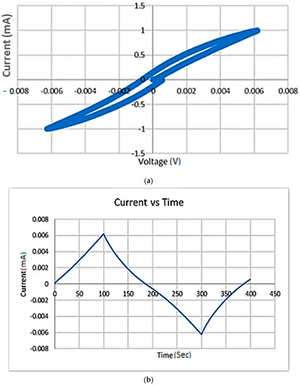 Cyclic voltammetry (CV) is an electrochemical test that enables the investigation of the sample’s stability (oxidation/reduction reactions) and the possible oxidation/reduction process. A potentiostat (SP-200, Biologic + cell with stainless steel electrodes) was used to perform the CV test, with a frequency range of 100 Hz–7 MHz and a voltage range of −2 V to 2 V. Moreover, the data was recorded and analyzed using EC lab software v11.02 (Biologic, Seyssinet-Pariset, France). The data was also used to calculate the charge capacity [14,15,16,17,18,19]. The charge capacity can be calculated by integrating the cathodal current area enclosed by CV and dividing it by the sweep rate of 10 mV/s.