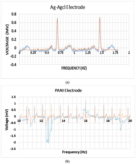 An ECG comparison between the fabricated PANI electrodes and the standard Ag/AgCl electrodes was performed, as shown in Figure 8. The ECG result using the fabricated electrodes appeared to be promising, but the signal to noise ratio was a bit higher than that observed in the standard Ag/AgCl electrodes; the reason could be due to the motion artifact or the 50 Hz noise within the room. However, the flexibility of the current electrode material and the absence of other liquid electrolyte material promises for more levels of conformability [23].