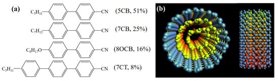 (a) represents the wt% constituents of the different monomers in the E7 LC mixture; whereas, (b) depicts the schematic of top and front views of MWCNTs (designed via Avogadro software []).