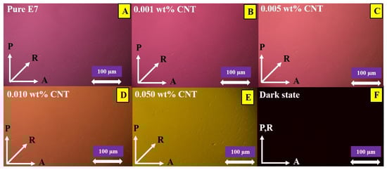 Figure 2 shows the polarized optical micrographs (POMs) of the pristine E7 LC and its mixtures exhibiting various concentrations of MWCNTs. In the POMs, rubbing direction was at 45° from the transmission axis of the polarizer. Figure 2a–e represent the bright states of the pristine E7 LC and their composites having 0.001, 0.005, 0.010 and 0.050 wt% concentrations of MWCNTs. It is noticed that the dispersion of MWCNTs has not affected the dark state of the E7 molecules; therefore, only a single dark state image, corresponding to the pristine E7 LC, has been depicted in Figure 2f. The homogeneous dispersion of MWCNTs in the E7 LC is evident from POMs. Any visible agglomerations or significant defects have not been observed. The uniformity of POM color in the entire bright state has also confirmed that the LC molecules are uniformly aligned in the nematic matrix of the E7 LC [,,,,]. However, the dispersion of MWCNTs in the E7 LC into different concentrations leads to the change in color of POMs, which is associated to the change in refractive index and/or birefringence (n) as reported previously [,,]. Besides, all the POM images have also been processed by ImageJ software to analyze the uniformity of color within a POM image. An intensity of ∼7 a.u. has been obtained via this processing, which further confirms that the LC molecules are homogeneously oriented towards long molecular direction in the cells.