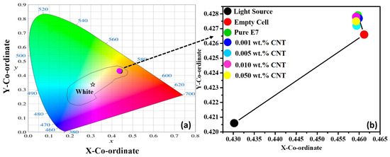 (a) CIE color chromaticity diagram and (b) CIE chromatographic coordinates of the pristine E7 LC and its composites with MWCNTs.