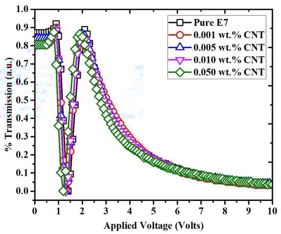 Variation of transmittance as a function of applied voltage (V-T curves) of the pristine E7 LC and its composites with different concentration of MWCNTs at room temperature (RT).
