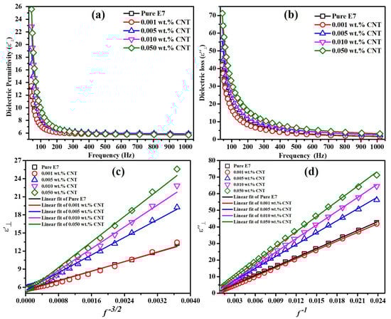 (a) Dielectric permittivity and (b) dielectric loss as a function of the frequency for the pure E7 LC and its composites with varying concentrations of MWCNTs. (c,d) represent the linear fitting of the experimental data of the corresponding dielectric permittivity and dielectric loss of the E7 LC at different doping concentrations of MWCNTs at RT.