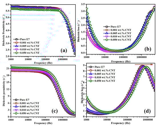 Room temperature dielectric spectra of the E7 LC and its composites with different concentrations of MWCNTs. (a) Dielectric permittivity and (b) dielectric loss of the homogeneously aligned LC cells; whereas, (c,d) represent the dielectric permittivity and dielectric loss of the vertically aligned LC cells, respectively.