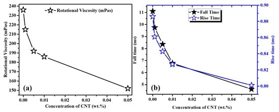 (a) Variation of rotational viscosity and (b) dynamic response of the pure E7 with different MWCNTs concentration.