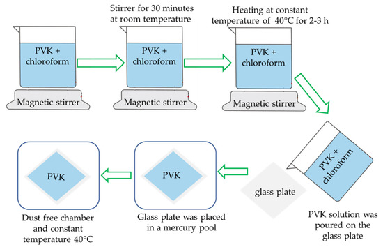 Thin films of pure PVK and ferrocene doped were grown by the isothermal solution casting technique. The pure and ferrocene-doped PVK is soluble in chloroform, dichloromethane, dioxan, Dichlorobenzene, and pyridine. The solvent for synthesis of thin film was prepared using chloroform (AR-Grade) (Merck, New York, NY, USA). The concentration of solution is strongly affected the film thickness. Initially, 100 mg of PVK was dissolved in 2 mL chemically pure chloroform. The solution was placed in glass beaker and was continuously stirred for 30 min with magnetic stirrer at room temperature. After that, the solution was heated up to 40 °C in order to find a uniform solution. For maximum dispersion, solution was stirred at a constant temperature approximately for 2–3 h. The substrate (optically flat glass plate) was carefully cleaned using hot water and acetone. The PVK solution was poured uniformly on the substrate and. The substrate was placed in a mercury pool to achieve perfect and uniform film thickness [17]. Later, the samples were heated at constant temperature of 40 °C in dust free chamber. The samples were subjected to dry for 12 h at constant 40 °C temperature. The samples were left at room temperature for another 12 h to remove traces of solvent. Synthesis process of PVK thin film are demonstrated by schematic diagram In Figure 1.