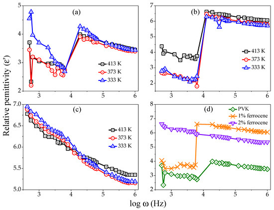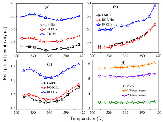 Figure 3a–c exhibits the temperature dependence (313–413 K) of at different frequencies for pure, 1%, and 2% ferrocene doped PVK, respectively. It is seen that the increases as the temperature increases at lower frequencies and decreases at higher frequencies. The comparative variation as a function of temperature for pure and doped PVK at frequency 100 kHz is shown in Figure 3d. It is observed that the value increases with doping concentration as a function of temperature. The temperature dependence of , representing the decreasing trends initially for all samples at low temperature 313 to 353 K, maybe due to the existence of water molecules in the samples. At high temperatures 353 to 413 K, sharply increases. The decrease in with temperature can be attributed to the fact that dipoles in polar are unable to orient themselves at lower temperatures. However, the orientation of dipoles is facilitated as the temperature is raised. Thus, orientational polarization increases and contributes to the increase in .