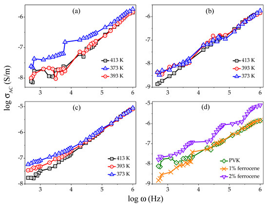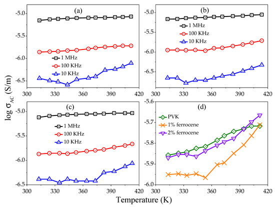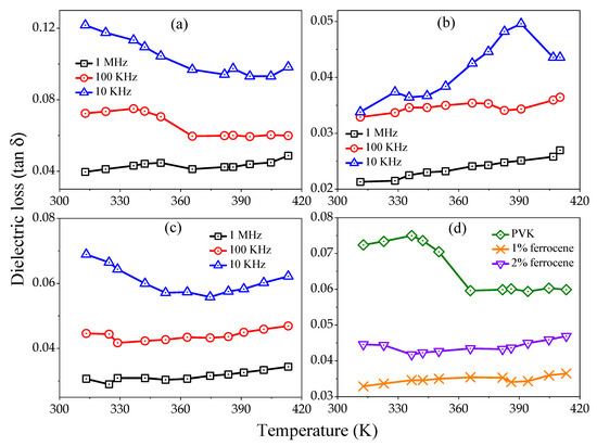 Figure 7a–c shows the variation of with the temperature at various fixed frequencies (1 MHz, 100 kHz, and 10 kHz) for pure, 1% and 2% ferrocene doped PVK. It is observed that the values for all samples are larger at higher frequencies. Figure 7d shows the variation of as a function of temperature for pure and ferrocene doped PVK samples at fixed frequency 100 kHz. It is also clear from figures that magnitude of increases as temperature increase from 313 K to 413 K. However, the effect of frequency on is significantly less at higher temperatures. It can be concluded that the conductivity of studied samples is bulk limited or field-dependent, mostly at lower temperature regions.