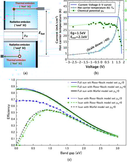 This section will first present the simulation results of an ideal hot-carrier solar cell based on the so-called Ross–Nozik model [2,7]. Then, we will provide further information regarding the comparison with other models. Figure 1a shows the thermodynamic mechanism involving an interplay between the ‘cool’ and the ‘hot’ carriers. Here, we have assumed a self-equilibrium between the hot-carrier temperature and chemical potential . It is known that a competing behavior exists between and , and the mechanism is represented by the following equations: