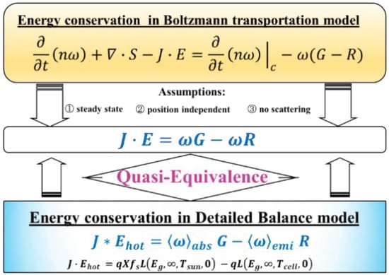 As it can be seen from Figure 2, a quasi-equivalence is built between Equations (12) and (13). As is known, is the most important and governing parameter in the thermodynamic model of hot-carrier solar cells. By comparing Equations (12) and (13), it can be seen that plays a similar role as the electric field, , does in Equation (12). This quasi-equivalence relation is conceptually illustrated in Figure 2.