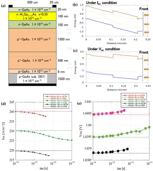 Based on the thermodynamic theoretical framework, we moved to further implement the proposed device simulation concept. Figure 3a shows the device structure of a specially designed GaAs solar cell. In order to enhance the electric field effect, the intrinsic layer (i-GaAs) was set to 100 nm with a narrow n-type emitter. The hot-carrier dynamics were tuned by varying the thickness of the AlGaAs barrier inserted between the i-GaAs and n-GaAs. Since the focus of the current work was to study the hot-carrier dynamics effect on a conventional solar cell rather than building a hot-carrier solar cell, the selective contact for extracting energy, , was not considered. Figure 3b,c show the band diagrams at the short-circuit condition and open-circuit voltage condition. The energy-dependent relaxation time, , was varied from to to examine the hot-carrier transportation dynamics. All of these results were compared with those calculated by the conventional DDM model, where the hot-carrier effect was not considered.