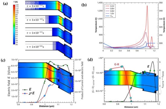 We plotted both the spatial distribution of and together with the hot-carrier temperature under the applied external bias, , as shown in Figure 4c. It was found that the hot-carrier temperature distribution was consistent with the electric field, , distribution while showing significant deviation from . On the other hand, it was found that the hot-carrier temperature distribution was strongly correlated with the net generation rate when the external bias was at ; these results are presented in Figure 4d. We also found an increase in the hot-carrier temperature with an increase in the relaxation time, i.e., a longer . All these results are consistent with Equation (15). It is also important to mention that from Figure 4d, we speculate that it is the difference in between the HETM and DDM simulation at that induced the increase of in the HETM simulation, as shown in Figure 3e.