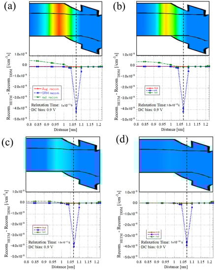 In the HETM simulation, we included the Auger, Shockley–Read–Hall (SRH), and radiative recombinations into the simulation. We found that for the device structure studied, an SRH recombination ( prevailed over the other two (Auger: ; Radiative: for both the HETM and DDM simulations. Including the SRH recombination was for practical purposes since realistic solar cells usually suffer energy dissipation, and its effect is comparable to that of the radiative recombination or even stronger [17]. Note that the recombination rate strongly depended on the applied bias voltage. This means that the SRH was the dominating recombination and directly affected the device’s performance, especially the fill factor. Detailed analysis results are given in Figure 5a–d, where the calculated three recombination dependencies of the relaxation time are given under the forward bias of 0.9 V. Meanwhile, in order to better understand the hot-carrier effect, we plotted the difference between the HETM and DDM models. As shown in Figure 5, the Auger, radiative, and SRH recombinations showed different tendencies for the two models: the HETM showed a much higher value for the Auger and radiative recombinations than the DDM but a lower value for the SRH recombination. It is also interesting to note that extending the relaxation time enhanced the tendency, i.e., longer lifetime, rendering a further higher value for the Auger and radiative recombinations and a further lower value for the SRH recombination. The lower value of the SRH at 0.9 V contributed to the higher fill factor obtained from the HETM simulation, as mentioned in the previous section. It is worth noting that, unlike the electric field, the spatial distribution profile for the three recombinations showed no consistency with the spatial distribution profile of the hot-carrier temperature. This is indicated by the dotted line shown in Figure 5, which shows that the SRH minimal position keeps constant for all four types of relaxation time.