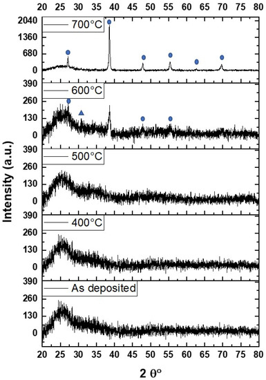 The transmittance increase after the film was subjected to 400 °C thermal annealing could be attributed to the decrease in defects and the structural relaxation of the amorphous film. The second annealing at 500 °C did not change the optical transmission since the crystal structure of the film remained the same. After the third annealing at 600 °C, the transmittance decreased due to the onset of crystallization and changes in local bonding. This decrease in transmittance was even more apparent after the fourth annealing at 700 °C. Indeed, the transmittance decreased due to larger scale crystallization, with the formation of a few major crystalline phases. This trend of decreasing transmittance is consistent with theoretical models based on Rayleigh-Gans-Debye theory, according to which diffusion increases and transmittance decreases with increasing grain size [27,28].