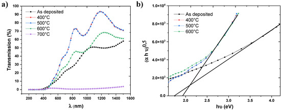 The optical spectra in Figure 3a show that the transmission increased after annealing at 400 and 500 °C. The film transmittance then decreased after annealing at 600 °C, and finally, the film transmittance decreased drastically after annealing at 700 °C. From the transmittance drop region, we deduced the optical gap of each measurement. The latter was estimated from the intersection of the extrapolation of the curve giving (αhυ)0.5 = f (hυ) with the x-axis [21] (see Figure 3b), where α is the absorption coefficient which can be calculated using the following formula: . Here, h is Planck constant and ν is the frequency of the light. The optical gap was 1.74 eV before annealing but 1.93 eV after annealing at 400 °C, 500 °C and 600 °C. However, after annealing at 700 °C, the film was so opaque that it was impossible to determine the optical gap (<< 1 eV).