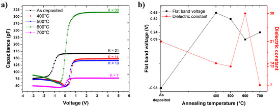 Figure 4a shows the capacitance measurements obtained before and after the different annealing processes. The dielectric constants (K) of each measurement, calculated from the maximum value of Cox in accumulation, are also displayed. As shown, the shape of the curves is almost identical, and some evolutions are noted (Figure 4b). First, the value of the dielectric constant (red curve) decreased after the first annealing at 400 °C (from K = 21 to K = 14), remained almost stable after the second annealing at about 500 °C (K = 13) and then increased strongly after annealing at 600 °C (K = 30) to finally drop after the last annealing at 700 °C (K = 7). Secondly, the flat band voltage VFB (black curve) increased strongly after the annealing at 400 °C. Then, it decreased after the annealing at 500 °C and 600 °C. Finally, after annealing at 700 °C, VFB rose again. The variation of VFB was reflected by a shift of the C (V) curves to the right, as was the case after annealing at 400 °C and 700 °C, or to the left after annealing at 500 and 600 °C.