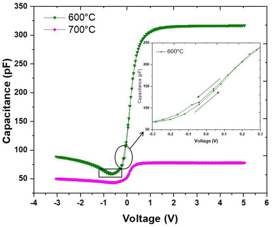 Figure 5 shows the measured C–V hysteresis characteristics of the LMO film after annealing at 600 and 700 °C. A zoom is performed to illustrate the extent of the hysteresis. A small dip (marked with a rectangle in Figure 5) in the weak inversion region of the C–V curves is visible. This behavior only concerns the curve obtained at 600 °C; it disappeared after annealing at 700 °C.