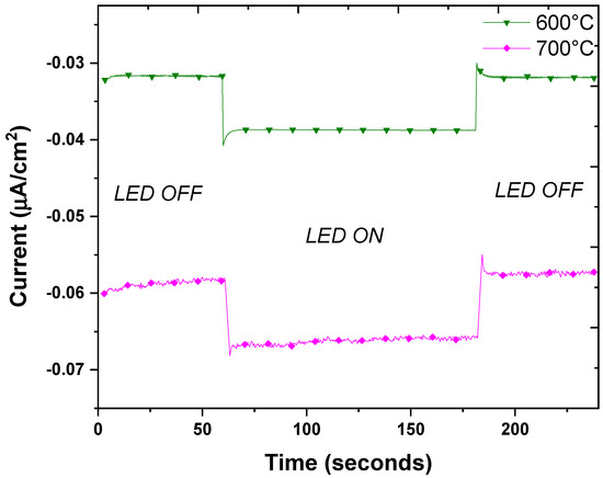 The exposure of the film to LED light, although very weak, led to the generation of a photocurrent. Figure 6 shows the results obtained after annealing at 600 °C and 700 °C. We observe that the current through the film was almost stable at the beginning in the dark. This electric current represented the leakage current in the material and was measured in function of the illuminated surface (i.e., sample size of 4 cm2). When the LED was turned on, the current increased and then returned to its initial value upon turning off the light. One evolution was noticed after the annealing at 700 °C. The value of the current in darkness increased from about −0.03 µA/cm2 to −0.06 µA/cm2. On the other hand, the variation of the current induced by the light seemed to be the same, i.e., approximately 2.5 nA/cm2.