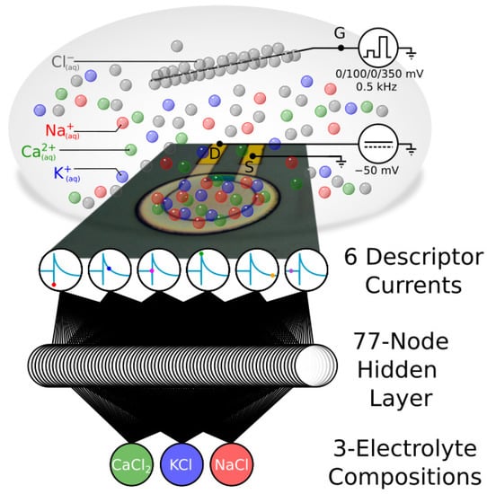 In this framework, we propose a proof of concept for identifying the relevant descriptors for an optimal ion recognition of the dynamic analysis of electrolyte blends using organic electrochemical transistors (OECTs). OECTs are state-of-the-art technology for both neuro-sensing and neuromorphic computing [14,15,16]. The two fields attest on the challenges of complex environment interfacing and of recognizing physically nontrivial information patterns, with OECTs potentially solving high interconnection-degree issues thanks to electronic/electrolytic coupling. These ion-sensing transistors operate upon the polarization of their three electrodes (namely the source S, the drain D and the gate G electrodes as depicted in the schematic Figure 1) to promote ion accumulation in the bulk of the PEDOT:PSS doped conducting polymer channel and modulate its conductance level under a steady state regime [17]. The current response of the device is also ion sensitive under a transient regime, such that the OECT’s drain current response is dominated by ionic currents [17]. Both physical mechanisms being distinct, it has been shown by impedance spectroscopy that both uncorrelated dependencies can be probed at different frequencies to exploit the dynamic response of the OECT for biparametric sensing. As such, it allows for the extraction of a cation-specific two-dimensional footprint from the single device without chemical labelling [18]. The later modelling of the OECT impedimetric responses under different conditions has revealed that the device gathers at least eight independent ion-sensitive circuit elements, demonstrating further potential to be exploited for higher order ion sensing [19].