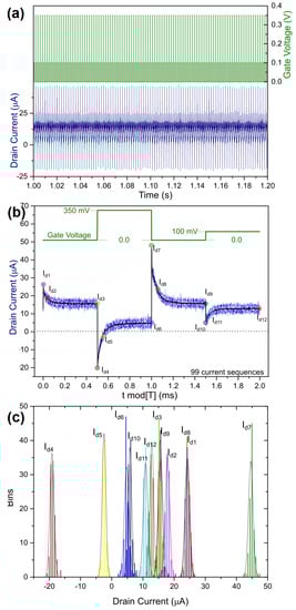 We dynamically analyzed the drain current of the OECT sampled as a relevant information carrier to analyze the electrolyte recognition. To embed both steady and transient information from the OECT, we applied a gate–voltage waveform, optimized for the drain current to gather a high multiparametricity of ionic information (a period higher than all the ion-specific OECT time constants) [18]. This elementary sequence used two voltage stimulations at VG = 100 mV and VG = 350 mV, which stimulated the OECT under two different regimes (as a transistor is a nonlinear element for the voltage, the two ion-specific data sets are not necessarily linearly correlated). The two voltage steps were separated by resting times (VG = 0) of equal duration to collect the ion-specific transient current of a charge and a discharge at a specific stress (as the anions and cations have different charge accumulation modes in the OECT, the asymmetry in the transient might gather a higher-order information). The duration of the voltage steps was set at 0.5 ms to collect the complete transient dynamics of the OECT charge and discharge, from which the characteristic current gathered both high-frequency and low-frequency impedance information. It has been observed that the characteristic time of the current transient could allow further downscaling of the elementary period, so such an elementary period was set below 1 ms, which was shorter than was the neural action potentials observed in neuro-sensing.