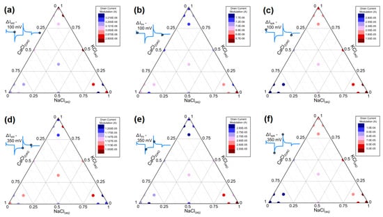 Ternary diagrams representing the mean drain current modulations ΔI at the steady states (a,d), the transients (b,e), and the spikes (c,f) for the 100 mV (a–c) and the 350 mV (d–f) gate modulations for the 25 different electrolyte environments of various KCl(aq), NaCl(aq), and CaCl2(aq) compositions (details of the 25 different compositions as supporting information are provided in Table S1).