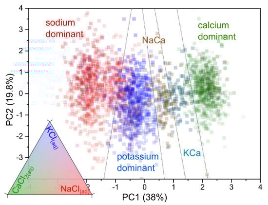 Two-principal-component projections of the 99 vectors for each of the 25 electrolyte compositions. Color gradients according to the relative concentration of KCl(aq), NaCl(aq), and CaCl2(aq) in 0.1 M (the bottom-left triangle displays the 3-color shade encoding the electrolytes’ composition). The graph shows the data separability, according to the nature of the cation, into five different domains representative of the electrolyte composition.
