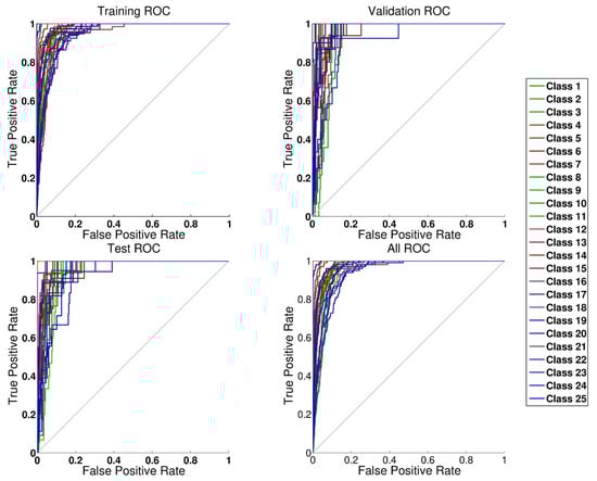 Data were analyzed as generated from the parameter analyzer without electronic or digital prefiltering. All data analyses (PCA and ANN) were performed a posteriori the acquisition. Principal component analysis (PCA) was performed using the open-access online tool ClustVis, scaled to unit variance and using the singular-value-decomposition method [23]. After this, we created an artificial neural network (ANN) in order to test the recognizability of the electrolyte composition. We analyzed a number of architectures and found that ANN that consists of 77 nodes in the hidden layer, and training with scaled conjugate gradient backpropagation provided the best results. As seen in Figure 3, the environments were reasonably well separated, and we used 99 different realizations of the same environment. During training, we chose 70% of the data as a training set, 15% as a validation set, and 15% as a testing set. We performed two different sampling methods. In the first one, we sampled training, validation, and testing sets completely randomly from all the data sets. In the second, we sampled the same ratios from each individual environment. We found that the error and error percentage were similar in both sampling methods, although the second sampling scenario was a percentage or two percentage points better. We also performed different tasks. In the first one, we considered the precise categorization of the environment with ANN; therefore, we had 25 output nodes related to each of the 25 different environments. In the second task, we evaluated whether we had categorized correctly when the data set contained more than x% of certain ionic concentration. The receiver operating characteristic (ROC) curves and confusion matrices were generated from the descriptor analysis via an artificial neural network.