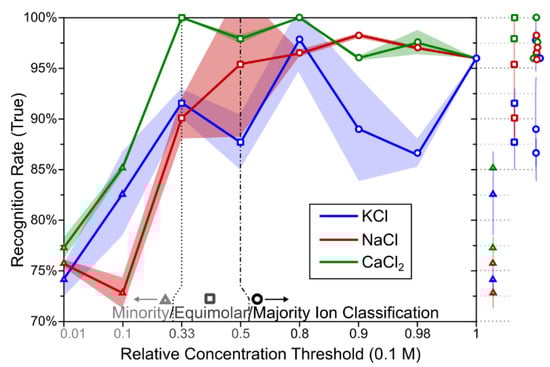 True recognition rate for the thresholding task. One can observe that Ca2+(aq) is systematically better recognized than are other ions as predicted by the PCA results. Increased standard errors for the tasks Na+(aq) > 0.5 (50 mM) and K+(aq) > 0.9 (90 mM) are related to two different minima in the learning task. Excluding these minima, errors become comparable to those of the other tasks.