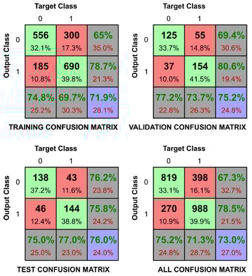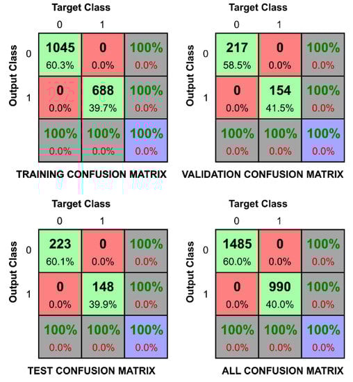 Confusion matrices to verify if the level of Na+(aq) is larger than 0.1 (10.0 mM). In the upper left panel, the confusion matrix of the training data set is presented. In the upper right panel, the confusion matrix of the validation data set is presented. In the lower left figure, the confusion matrix of the test dataset is presented. In the lower right corner, the confusion matrix of the whole dataset is presented. 0 on the axis represents false and 1 represents true. The target class is the proper classification of the dataset, while the output class is the inferred classification of data. The variability of the confusion matrix entries is consistent across all the data sets.
