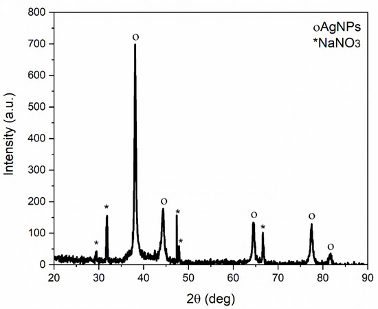 XRD patterns of AgNPs (before mixing) showing the signature of Ag (o) and the one of NaNO3 (*).