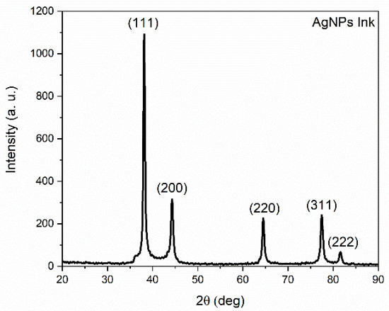 The X-ray diffraction (XRD) pattern of the synthesized AgNPs is shown in Figure 1. Their FCC structure is identified in JCPDS 00-004-0783 [19]. This measurement shows the presence of intense peaks at 38°, 44°, 64°, 77°, and 81°, related to XRD onto the crystalline planes of (111), (200), (220), (311), and (222) orientations, respectively. The presence of NaNO3 is also detected (JCPDS 00-036-1474) [19] as a secondary product resulting from AgNP synthesis [20,21]. This compound may be present as a precipitate before mixing with H2O2. After mixing, only the diffraction peaks of Ag are observed in Figure 2, which means that most of NaNO3 has been removed without requiring any additional purification process [14]. Such a feature indicates that H2O2 acts as a reducing agent during AgNP-based ink preparation [14,22]. The different noise contributions to the data reported in Figure 1 and Figure 2 resulted from the use of different acquisition times. It is also noteworthy that for both samples, no silver oxide was detected. This point will be discussed in more detail in the next section, related to their SEM/EDS analyses.