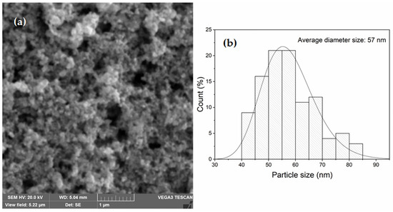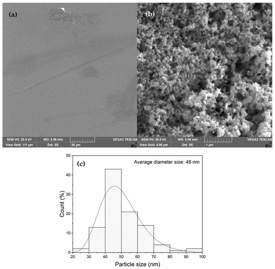 The investigations by SEM are presented in Figure 3. Figure 3a shows the surface of the clean photographic paper before the ink deposition, while Figure 3b shows the sample surface obtained after deposition, followed by a drying time of 15 min at RT. For the latter, the ink film results in the agglomeration of particles of a spherical shape, which is in agreement with previous studies [26]. The average diameter of the AgNPs contained in the deposited ink was estimated using ImageJ software, where more than 100 NPs were accounted for. From the SEM images, the average size of the nanoparticles is 48 ± 12 nm after fitting the AgNP size distribution histogram in Figure 3c using the standard log normal function described in the references [27,28,29]. The same approach was conducted for the particles without dispersion in H2O2; see Figure 4a, where an average size of 57 ± 10 nm is found, as computed in Figure 4b. The decrease in the average diameters of AgNPs inside the functionalized ink is attributed to sonication effects [30,31].