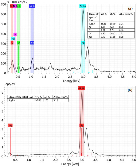 Regarding the apparent absence of silver oxide (or its concentration, which could be lower than the detection limit of the EDS analyzer), it may be related to the redox mechanism induced by H2O2, leading to the generation of Ag+, hydroxyl radicals, and superoxide anions. According to the work of Sundaresan et al. [36], it has been suggested that the formation of symmetric or asymmetric oxide layers at the outer surface of the AgNPs strongly depends on the experimental conditions. The authors mentioned that the ionization of Ag over the whole outer surface of the AgNPs can prevent or drastically limit its oxidation. Such a scenario could also be compatible with the reduced pH of AgNP-based ink.